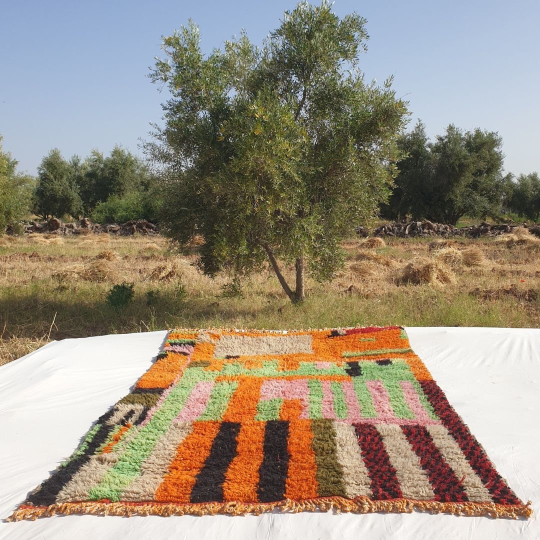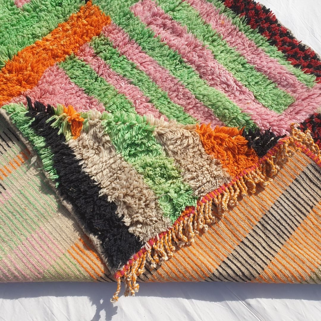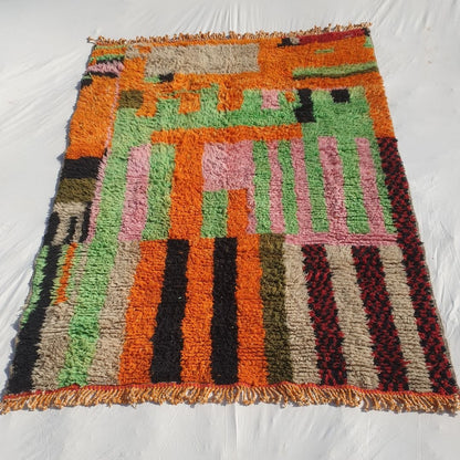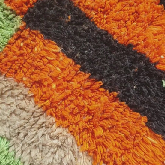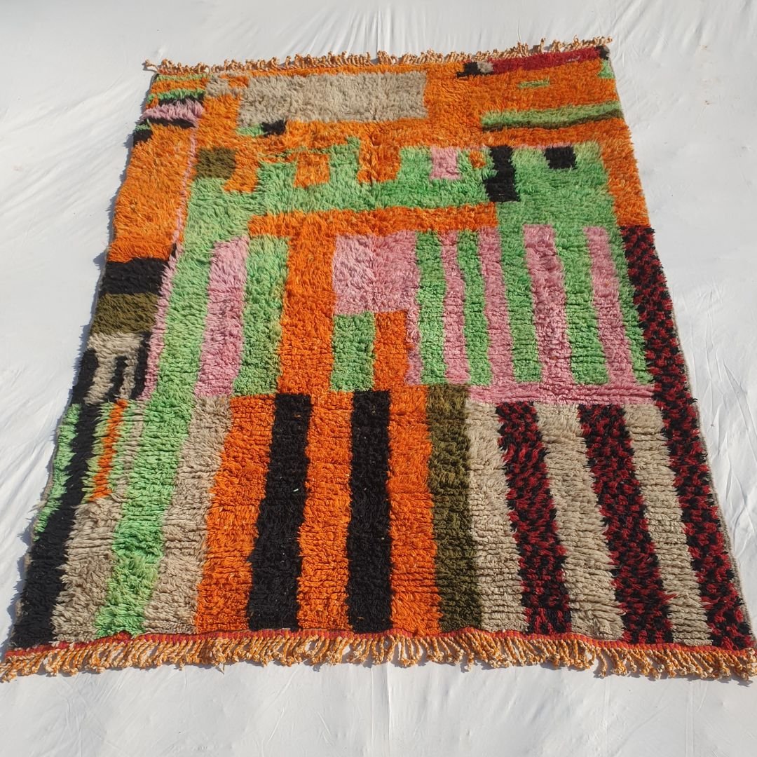 Add a splash of color to your space with this large Beni Mrirt luxurious rug, sized 7'22x10' Ft | 220x305 cm. Handwoven with exceptional craftsmanship, this ultra-soft, plush rug features a vibrant multicolored abstract design in orange, green, pink, black, and cream, perfect for making a bold statement in living rooms or dining rooms. Known for their unparalleled softness, Beni Mrirt rugs combine comfort and artistry. Crafted from 100% natural wool, this large Moroccan rug is a stunning addition to bohemian or modern decor.