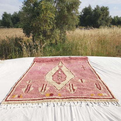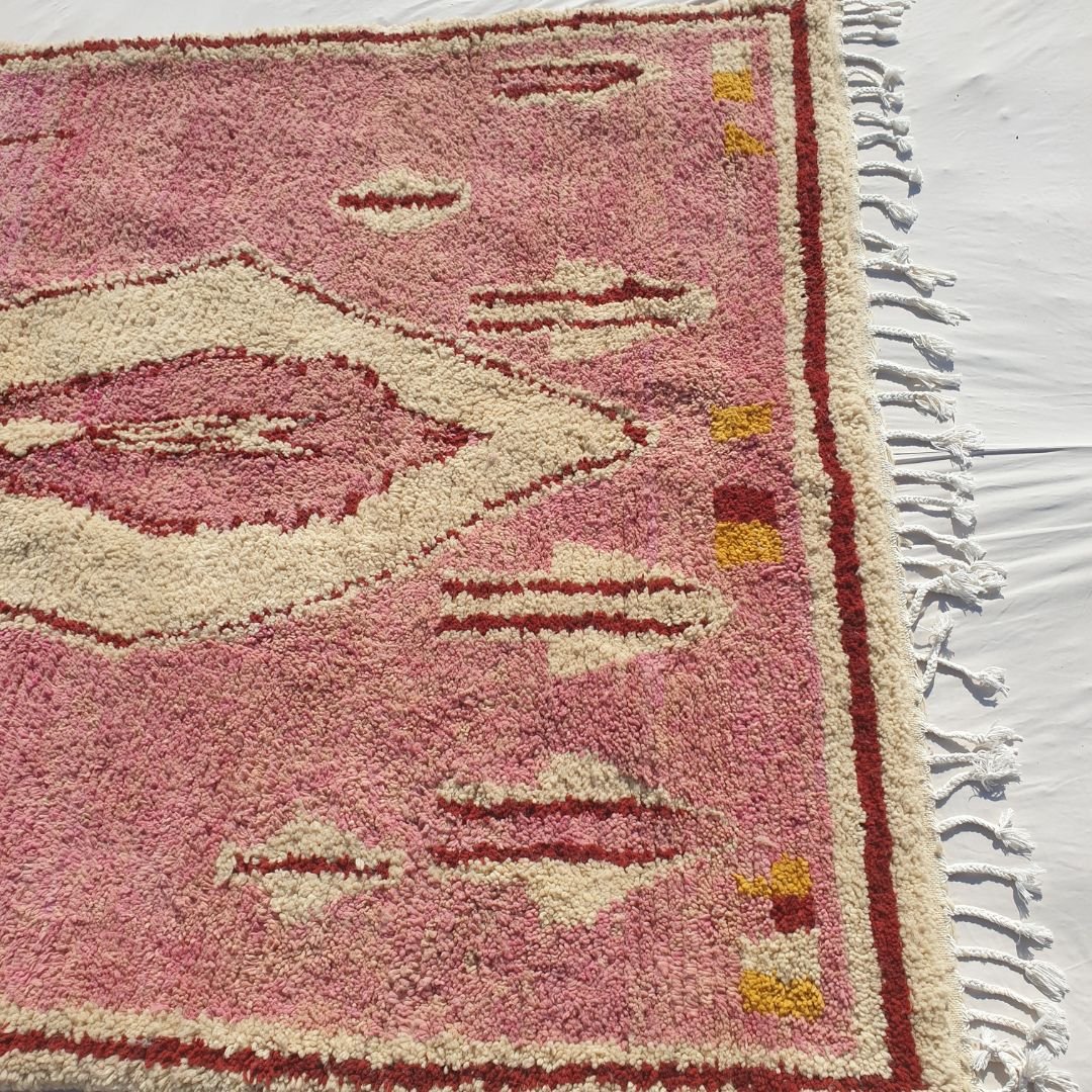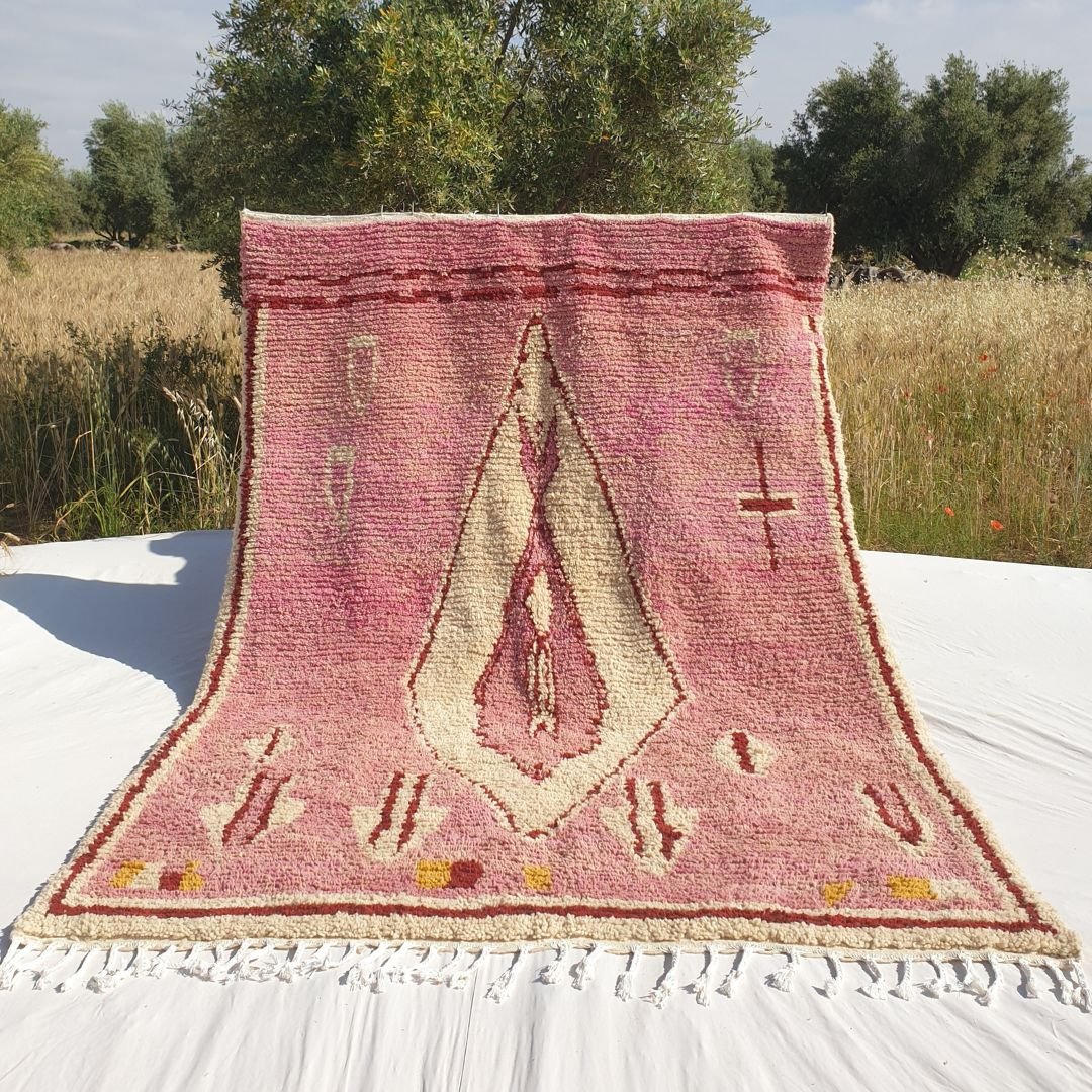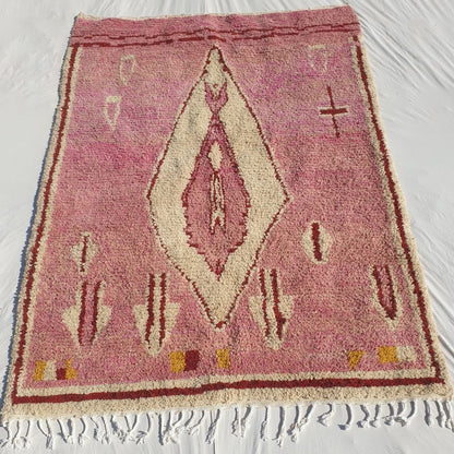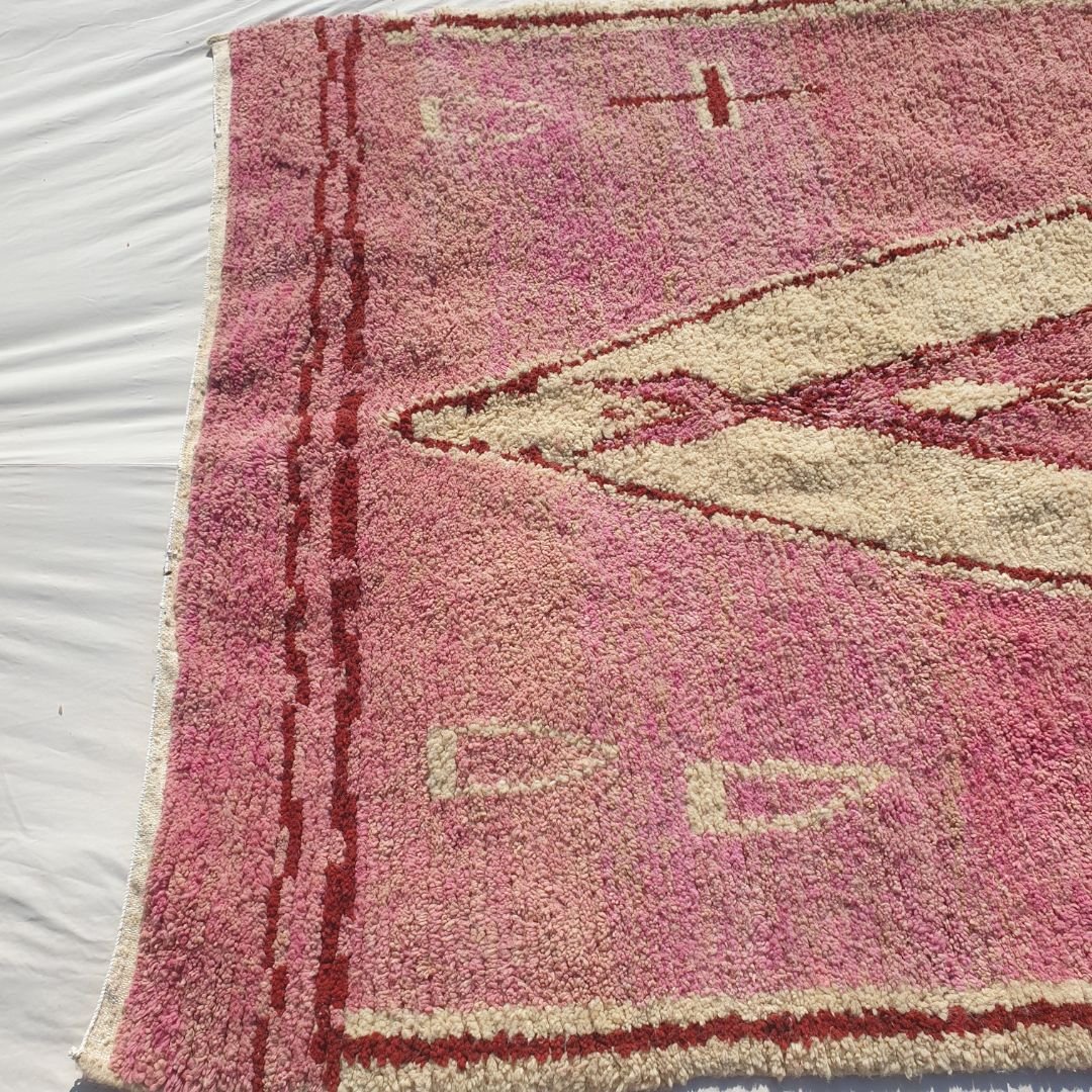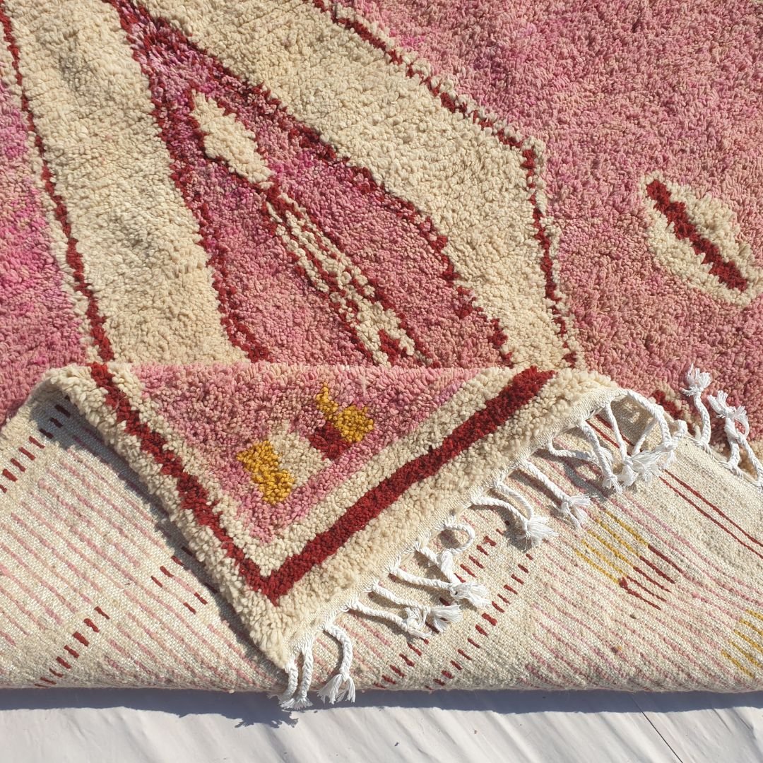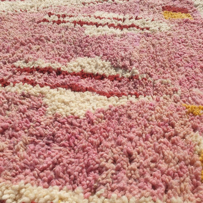 This Pink Boujad Moroccan Rug, measuring 7x9 ft, is a stunning addition to any space with its soft and plush texture. Handwoven by skilled artisans, it features a bold abstract design with a distinctive, artistic shape that evokes a unique, feminine form. The vibrant pink hue adds a pop of color, perfect for modern, eclectic, or bohemian decor. Ideal for a living room or bedroom, this rug combines comfort and creativity, making it a one-of-a-kind statement piece.