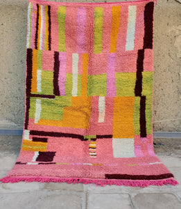 Boujaad, the Amazing Berber lightweight’s rug. The design is Inspired from the Kilim rugs. Named also Hanbal, because of its Boho, Modern, Scandinavian, and traditional Berber Moroccan style, it has only one side, it is usually used for floors or to decorate the walls of the interiors.