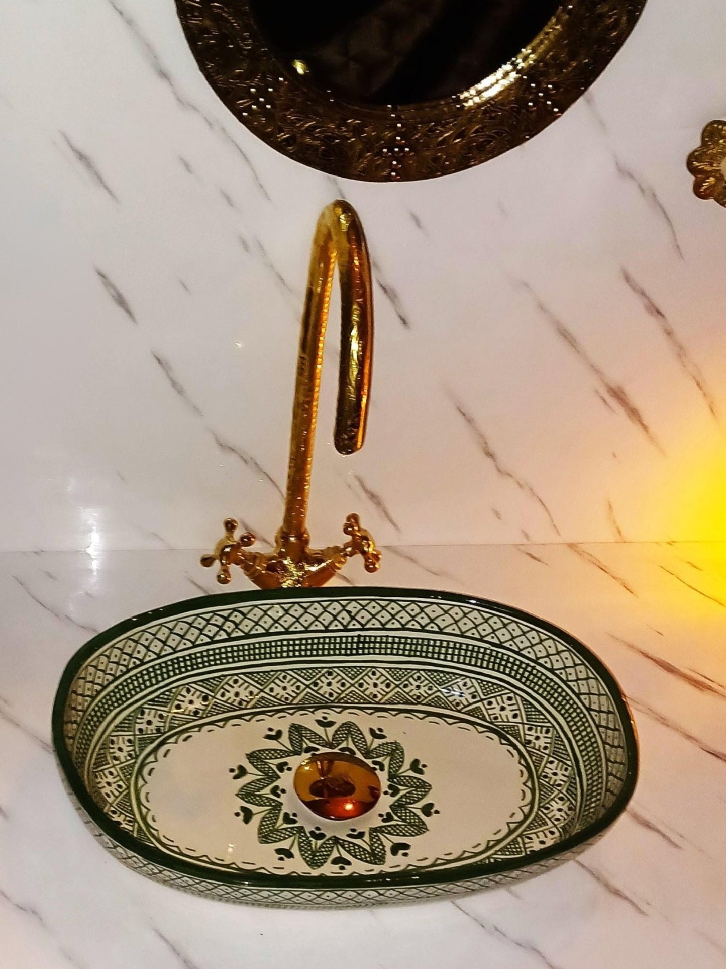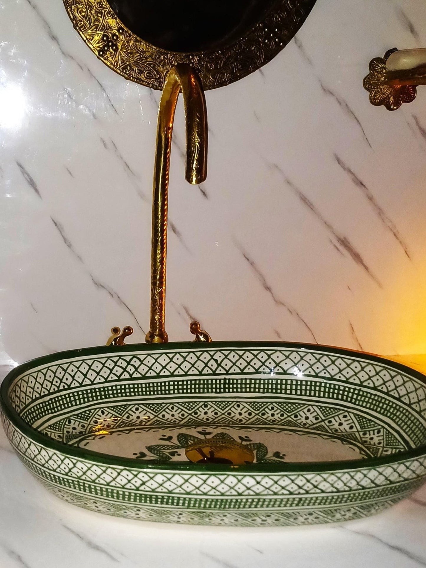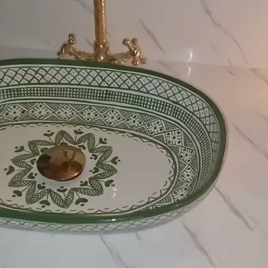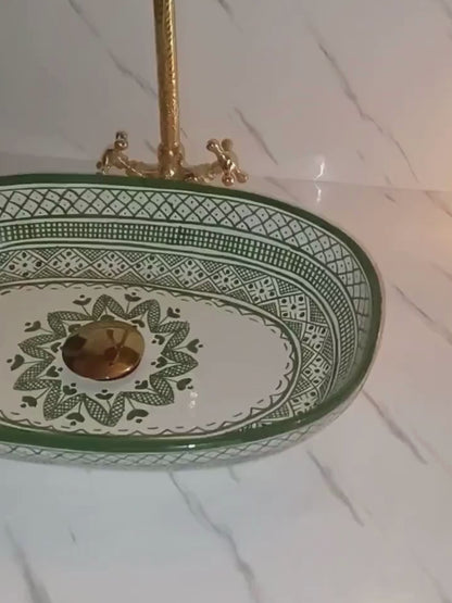 Vienna - Handmade Moroccan Oval Ceramic Sink – Green Geometric Top Counter Vessel Sink - (ETAFS)