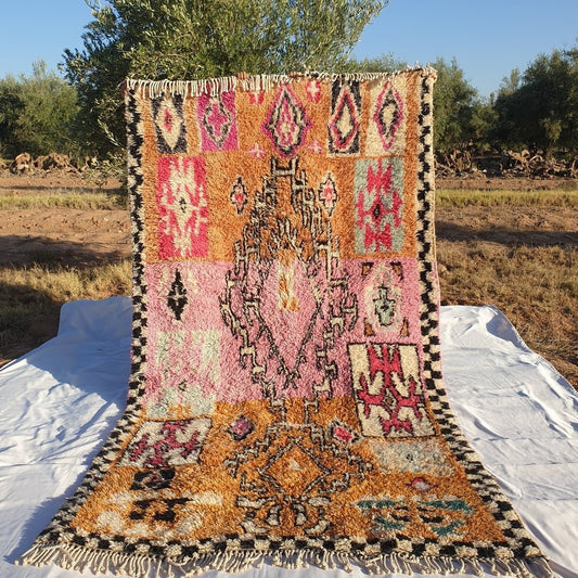 Anpassad BENI OUARAIN MATTA Mjuk & Tjock Rosa Orange Vardagsrumsmatta | Marockansk matta med hög lugg Berber Autentisk ull | 2,6x2 m | Sarhana