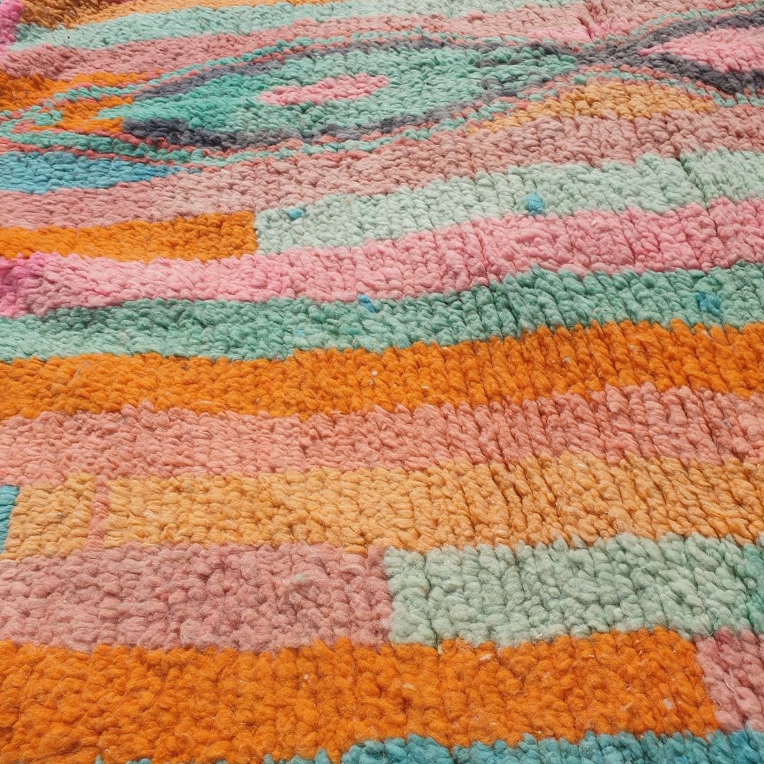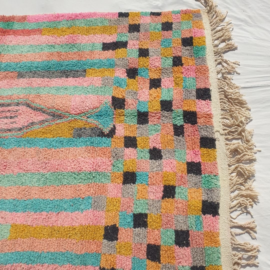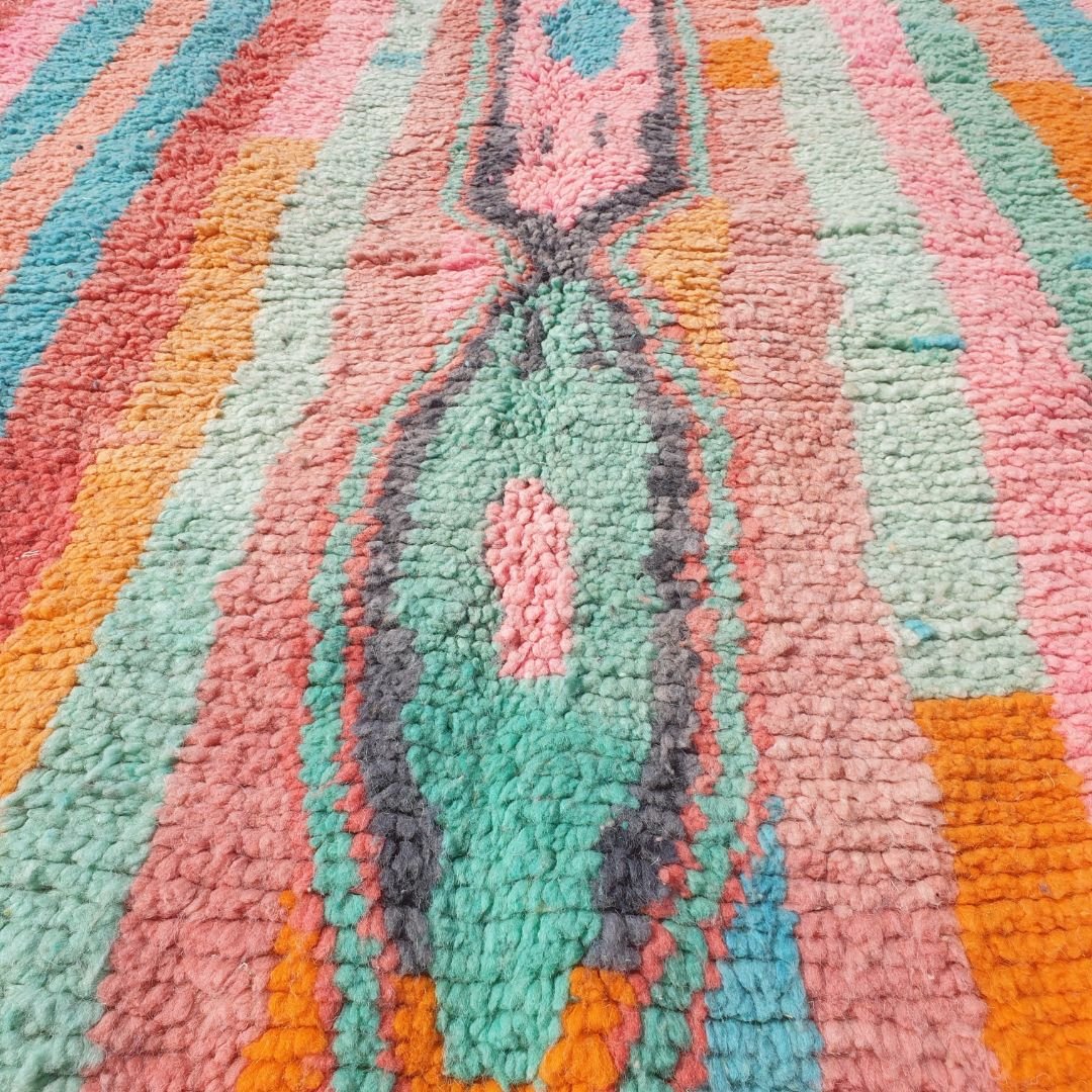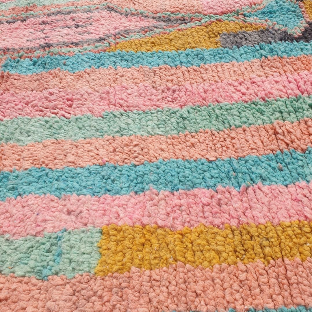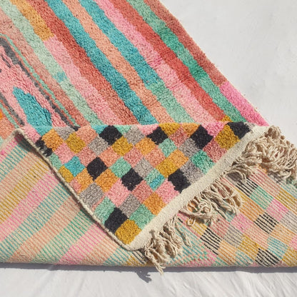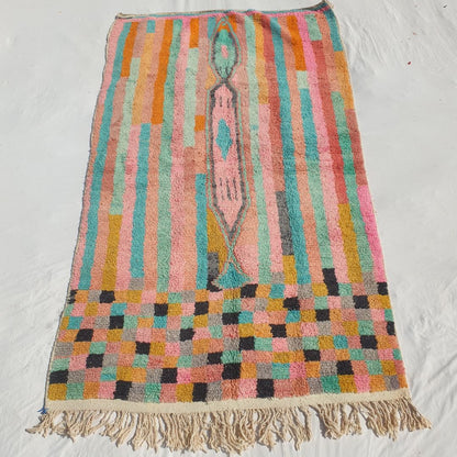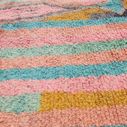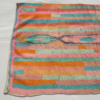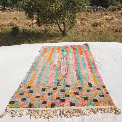 Add a burst of color to your home with this vibrant Boujad 5x9 rug, measuring 5'15x9'22 Ft | 157x281 cm. Handwoven by skilled Moroccan artisans, this 5x9 area rug features a stunning multicolored design with vertical stripes in pink, orange, yellow, teal, and gray, complemented by a central geometric shape and a playful checkered pattern at the bottom. Crafted from 100% natural wool, this 5x9 wool rug offers a soft, plush, and fluffy texture, ensuring both comfort and durability for years to come.